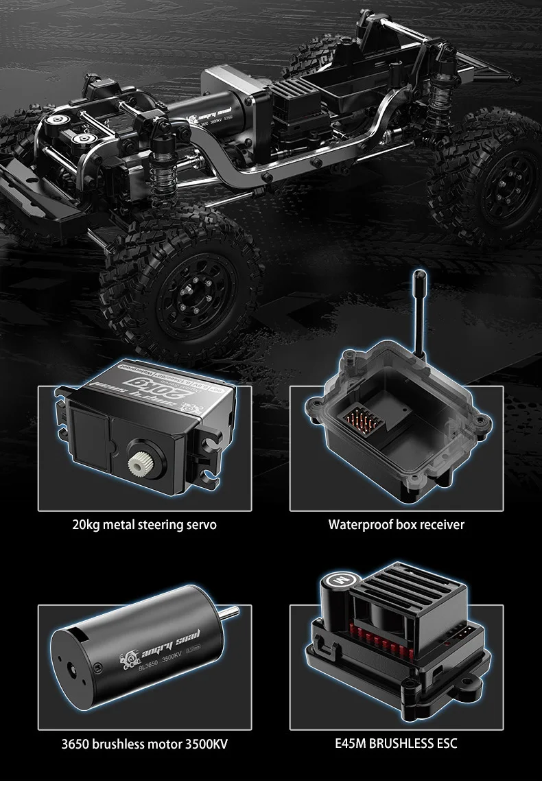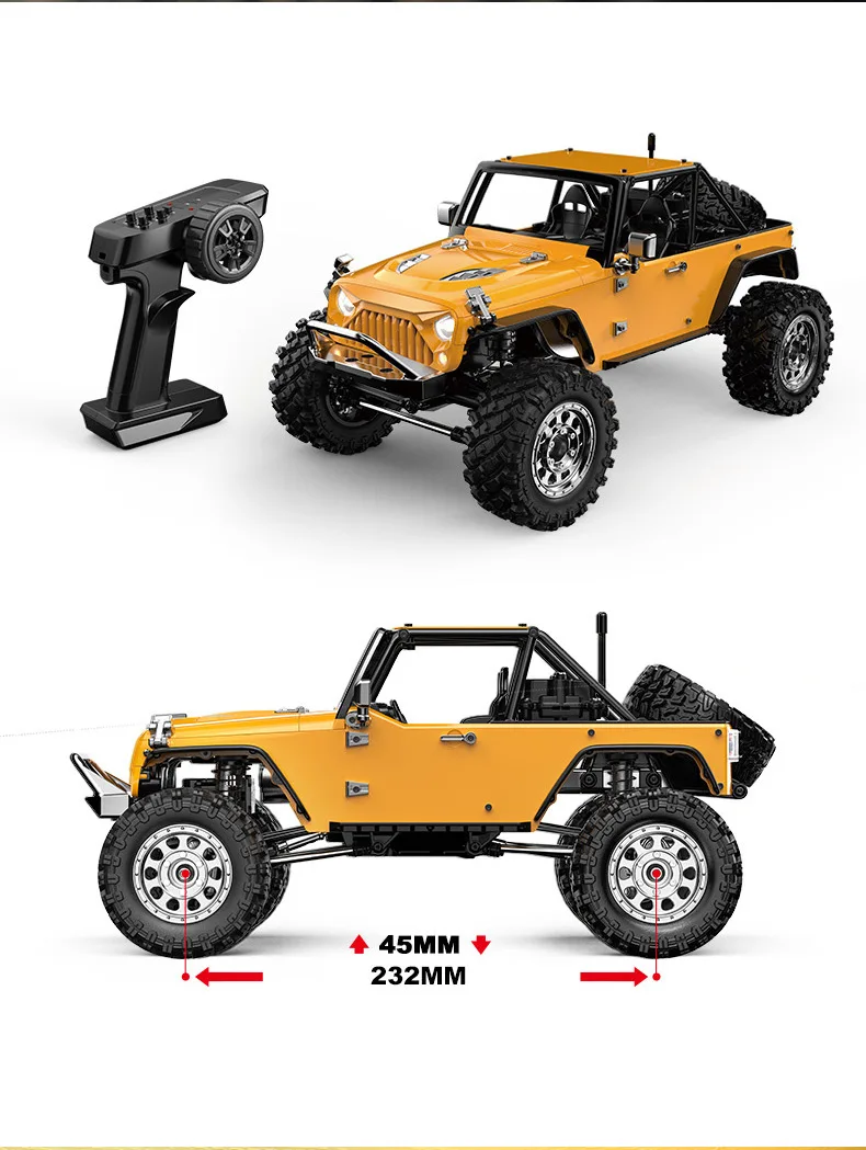 Packing list: Car body * 1 Remote control * 1 Remote control * 1 Instruction manual * 1 Hexagonal wrench * 1 Screwdriver * 1 Product selling points: 1. Aluminum material car shell Adjustable aluminum ring suspension with adjustable spring travel 3. Metal shock absorber bucket hydraulic shock absorber 4. Ball bearings for the entire vehicle 5. Front and rear axle metal gears, gearbox nylon gears 6. Front and rear i-door bridge 7. Whole car metal transmission shaft 8.20KG metal gear and metal shell servo (standard servo) 9. Front and rear light assembly 10. Double set of wheels, tires, and suspension springs