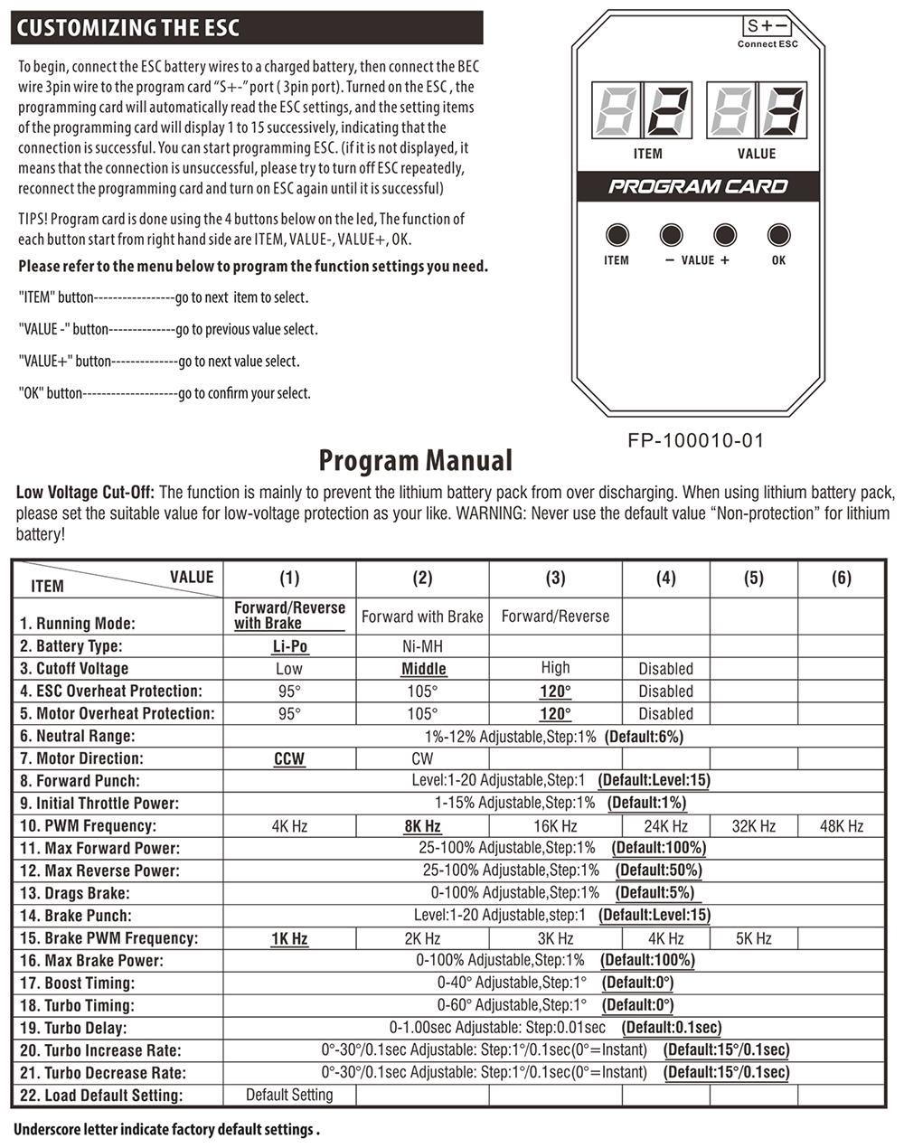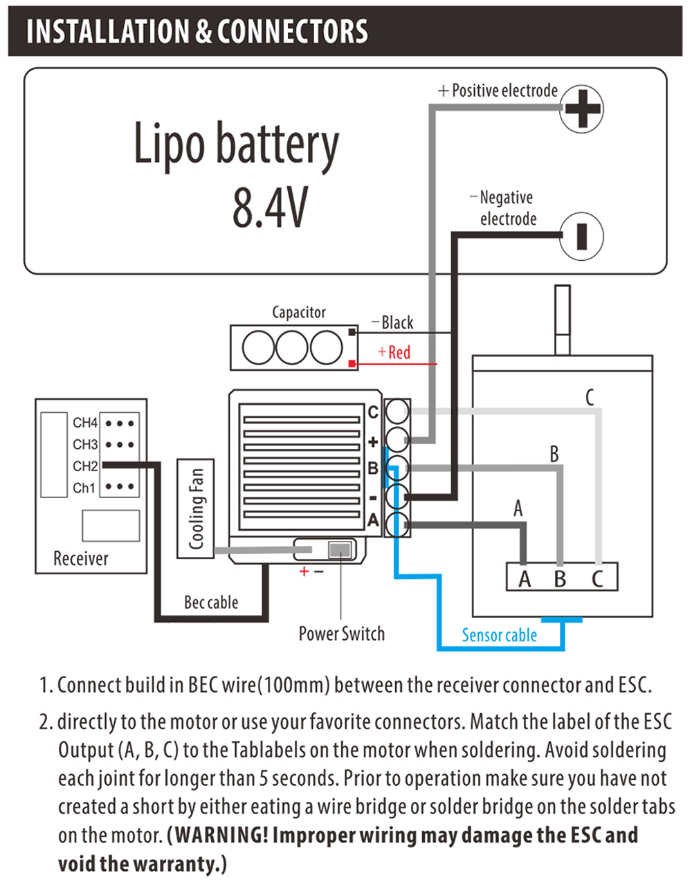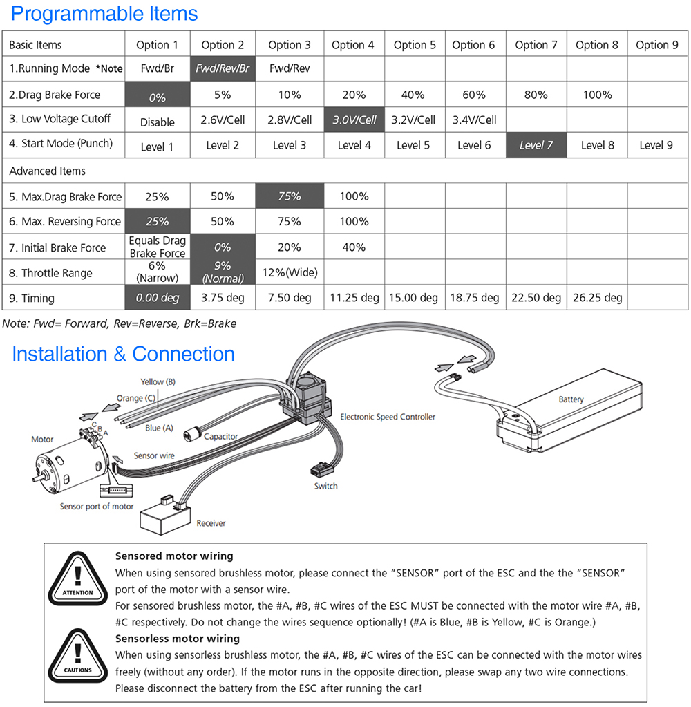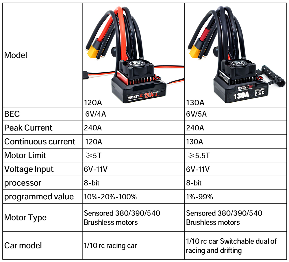 130A ESC Specifications: Forward/Brake/Reverse: Yes (Factory preset atForward/Brake) Dimensions:44.5(L)x39.5(W)x31(H)mm(including fan) Weight: 88.2g(including wires) Voltage lnput: 6V-11V Peak Current: 240A Continuous current :130A Motor Limit: ≥5.5T Motor Type: Sensored 380/390/540 brushless motors B.E.C.: 5A/6V