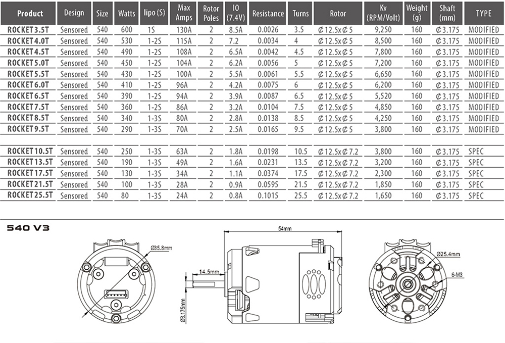 Motor Specifications: Brand:Rocket Item no.:540 V3 Pro Turns nunmber:3.5T 4.5T 5.5T 6.5T 7.5T 8.5T 9.5T 10.5T 13.5T 17.5T 21.5T optional Please read the parameter chart and instruction carefully